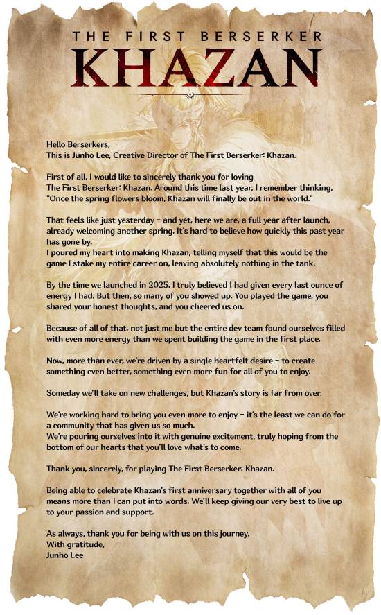 3月27日,硬核动作RPG《第一狂战士:卡赞》迎来发售一周年。开发商Neople与发行商Nexon公布了游戏首年玩家数据,并发布创意总监李俊浩的感谢信。李俊浩在信中表示,玩家的热情与支持给予了团队“比开发时更多的能量”,并透露“卡赞的故事远未结束”,团队正在努力筹备新内容。不过目前游戏在Steam平台仍锁国区。